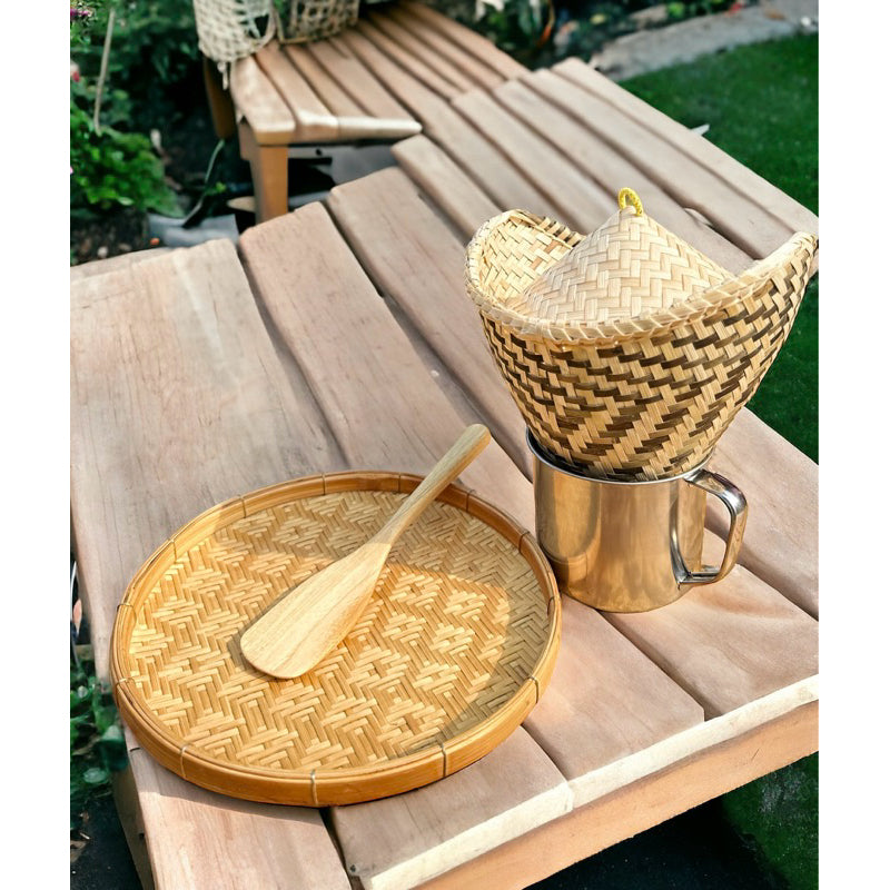 2. **Bamboo Steaming Basket (Huat Sticky Rice Basket):** The bamboo basket is conical or rounded in shape and is placed over the pot. Sticky rice is placed inside this basket, where it is steamed. The open weave of the bamboo allows steam to circulate evenly, cooking the rice thoroughly while allowing excess moisture to escape.