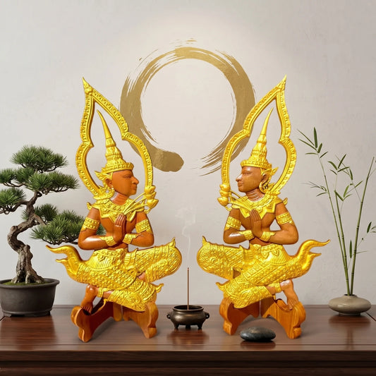 Pair of Hand-Carved Teak Buddhist Guardian Angel Statues