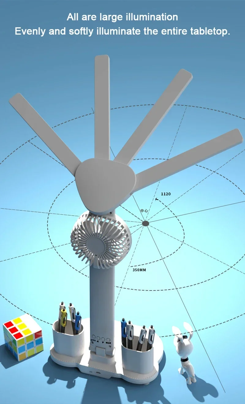 Experience the ultimate in workspace efficiency and convenience with our 3-in-1 Rechargeable Desk Lamp. This modern, multifunctional device seamlessly combines a powerful, dimmable LED light, a cooling fan, and a handy clock into one sleek unit. Designed for optimal multitasking and a clutter-free desk, this lamp is your functional and sustainable solution for staying cool, organized, and focused.